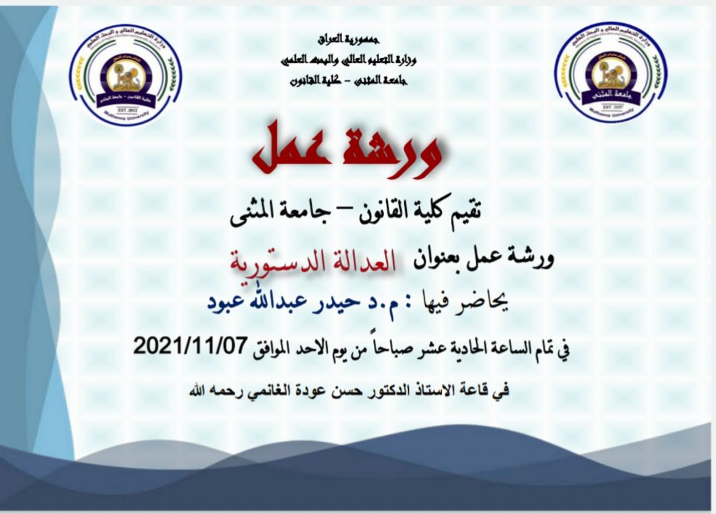 تقييم كلية القانون ورشة عمل بعنوان «العدالة الدستورية» يحاضر فيها التدريسي (م.د حيدر عبدالله عبود) في تمام الساعة الحادية عشر صباحاً من يوم الاحد الموافق 2021/11/07 […]
