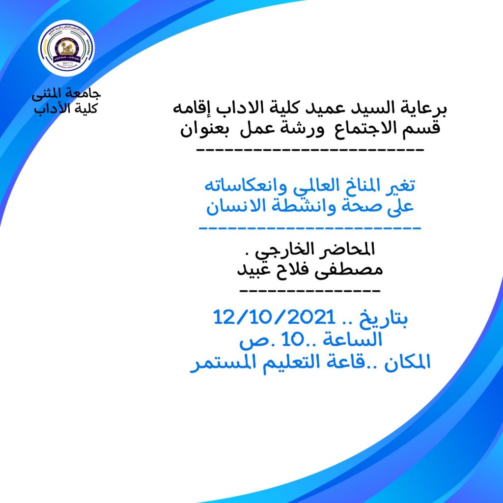 إقامت كلية الاداب ورشة عمل بعنوان تغير المناخ العالمي وانعكاساته على صحة وانشطة الانسان المحاضر الخارجي مصطفى فلاح عبيد بتاريخ 12/10/2021 نبذة عن النشاط تهدف الورشة […]