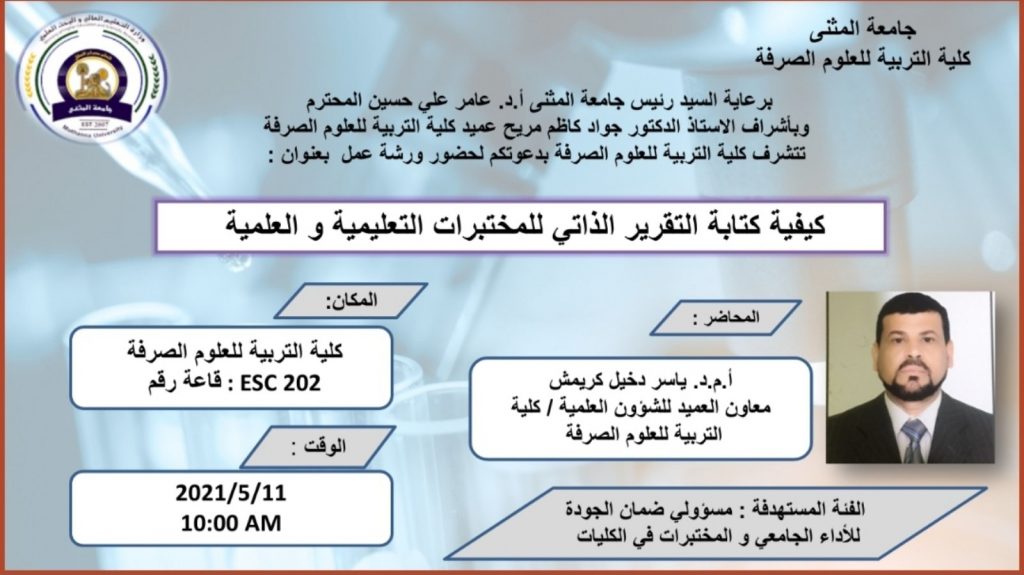 10/05/2021ورشة عمل في كلية التربية للعلوم الصرفة/قسم علوم الحياة وباشراف السيد عميد كلية التربية للعلوم الصرفة بعنوان ( كيفية كتابة التقرير الذاتي للمختبرات التعليمية والعلمية)تقيم كلية التربية للعلوم الصرفة/قسم علوم الحياة وباشراف السيد عميد كلية التربية للعلوم الصرفة ا.د.جواد كاظم مريح ورشة عمل يحاضر بها ( ا.م.د.ياسر دخيل كريمش الاسدي […]