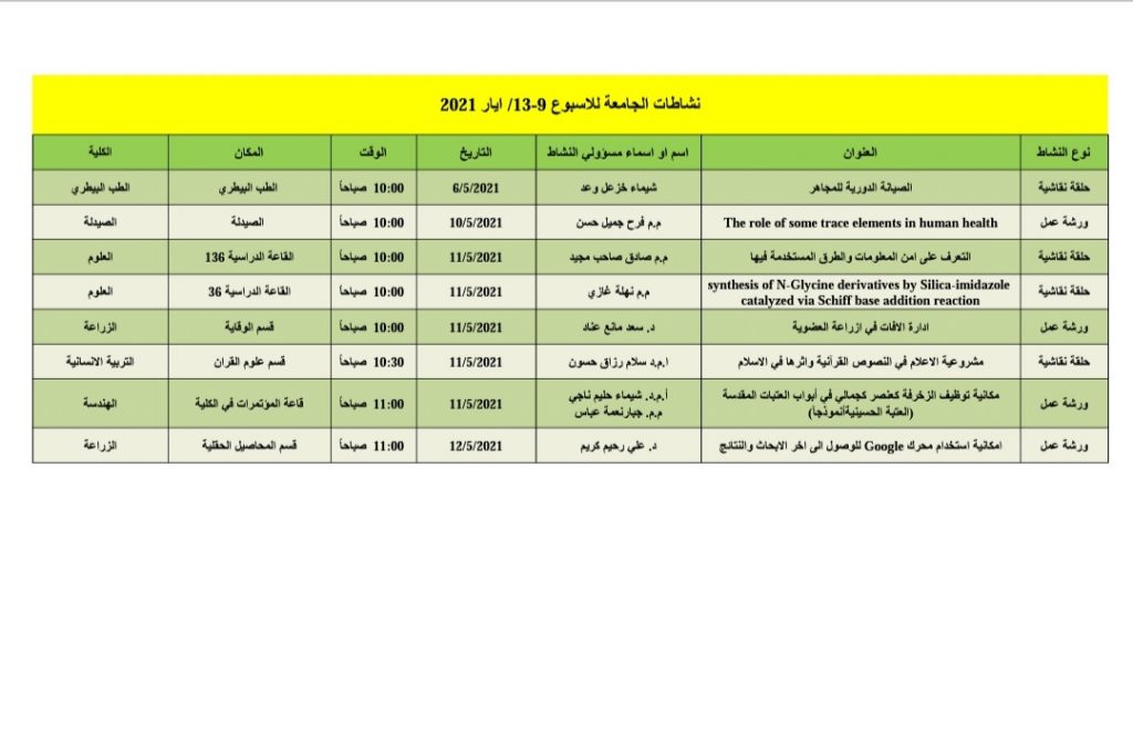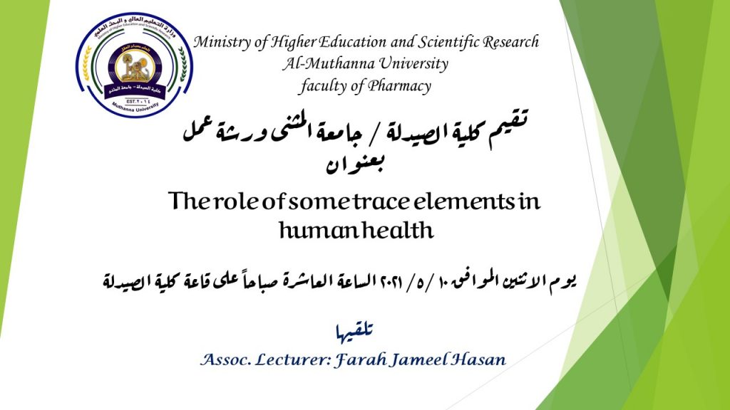 10/05/2021ورشة عمل في كلية الصيدلةتقيم كلية الصيدلة- جامعة المثنى ورشة عمل بعنوان( The role of some trace elements in human health) تلقيها التدريسية ( م.م فرح جميل حسن) يوم الاثنين […]